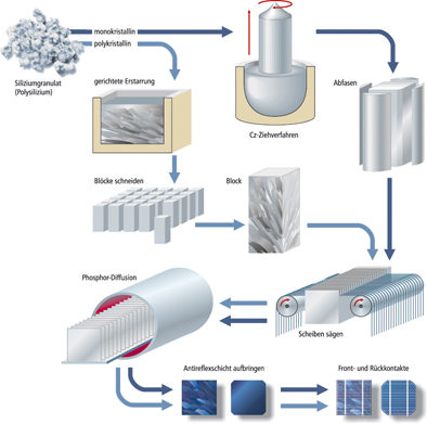 Die abgekühlten Siliziumblöcke (Ingots) werden zuerst in Stangen und diese wiederum in ca. 0,2 mm dünne Wafer- Scheiben gesägt. Die Dotierung und Kontaktierung polykristalliner Siliziumzellen erfolgt wie bei der Herstellung von monokristallinen Zellen.